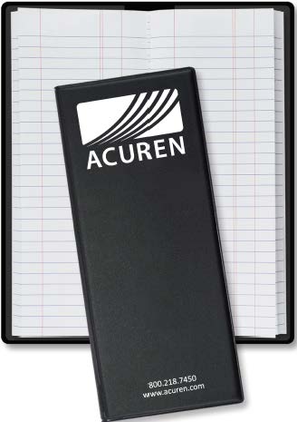 Acuren logo, phone number, and website will be screen printed on front cover in all white on black tally book.